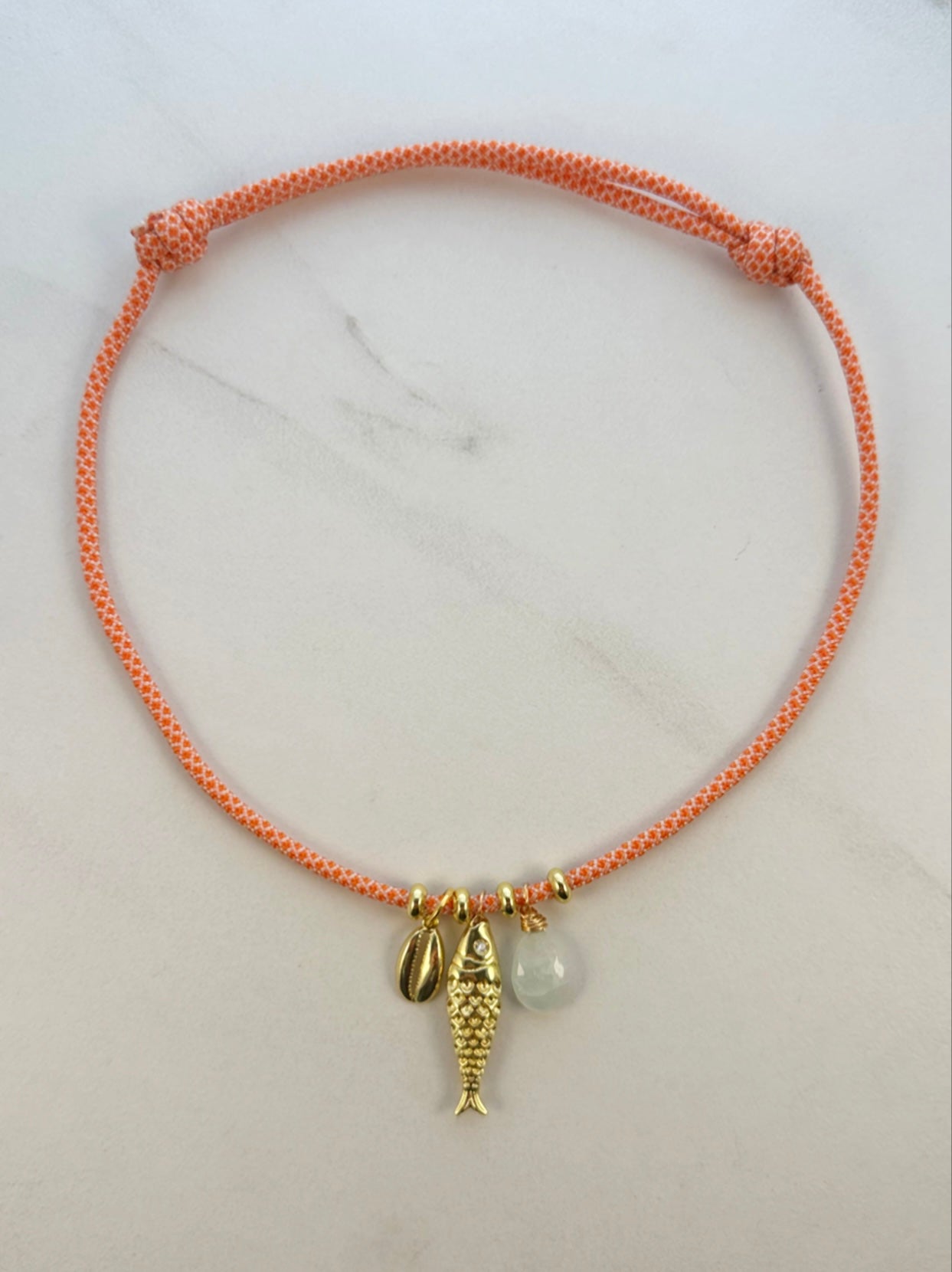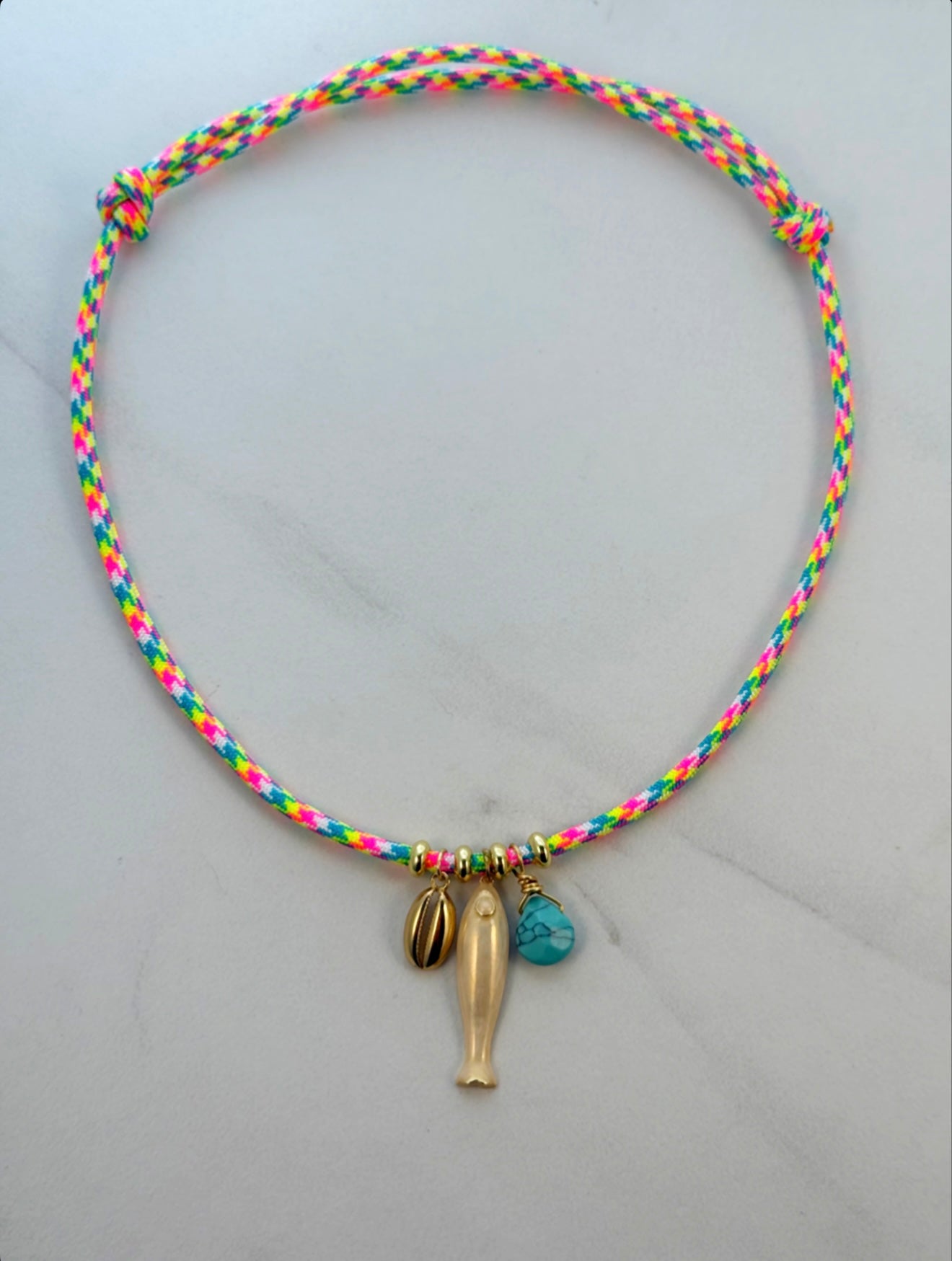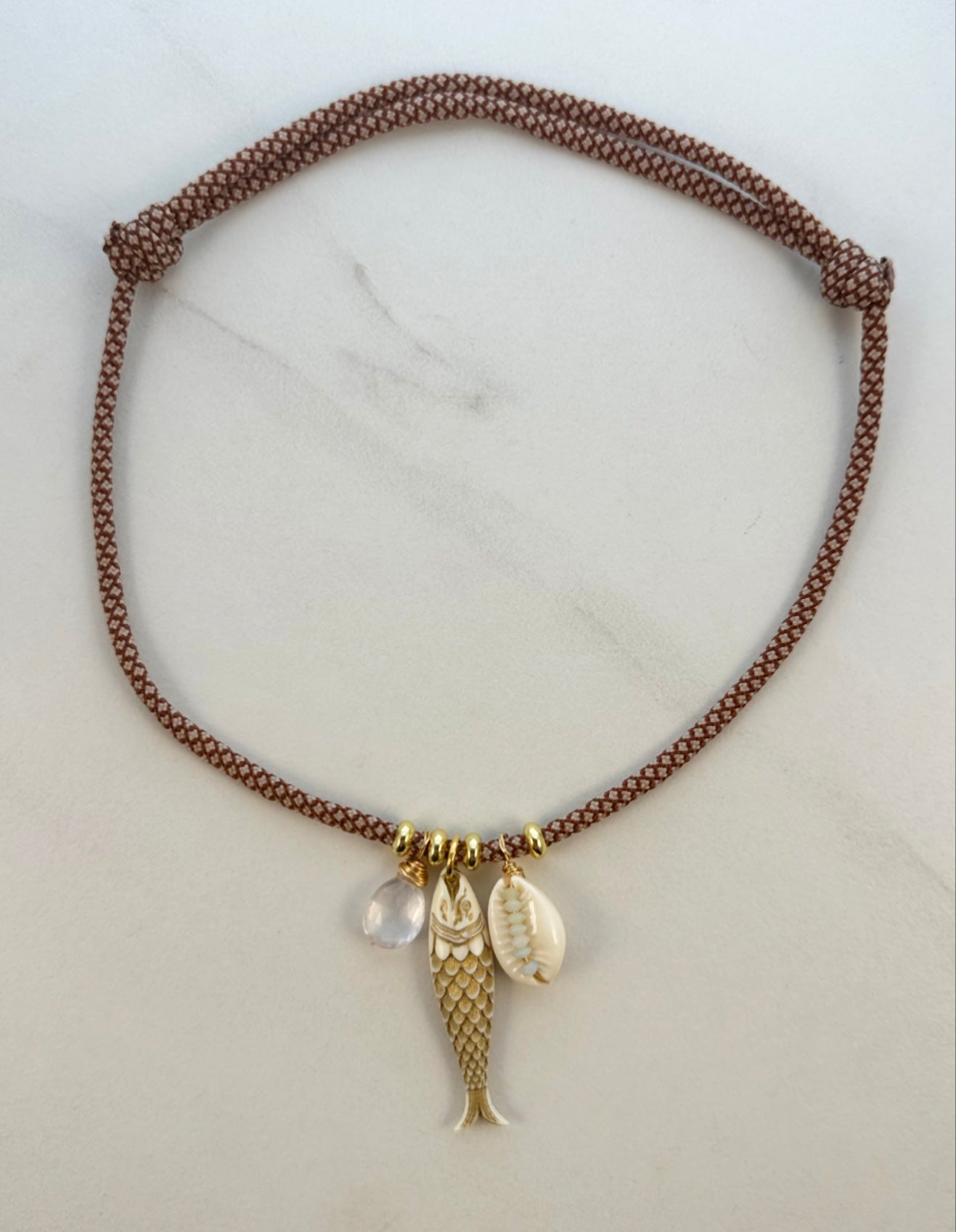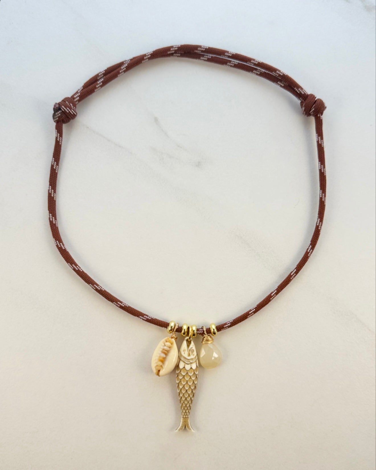 Bring the magic of the coast to your everyday style with our handcrafted Shoals Necklace. Made from strong, lightweight paracord, this adjustable necklace is designed for both comfort and durability. Featuring a fish charm, a natural cowrie shell adorned with gemstone accents, and a faceted gemstone briolette, it’s the perfect piece for lovers of the sea and adventure.